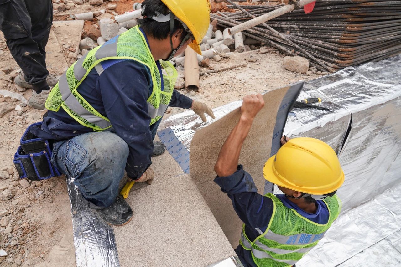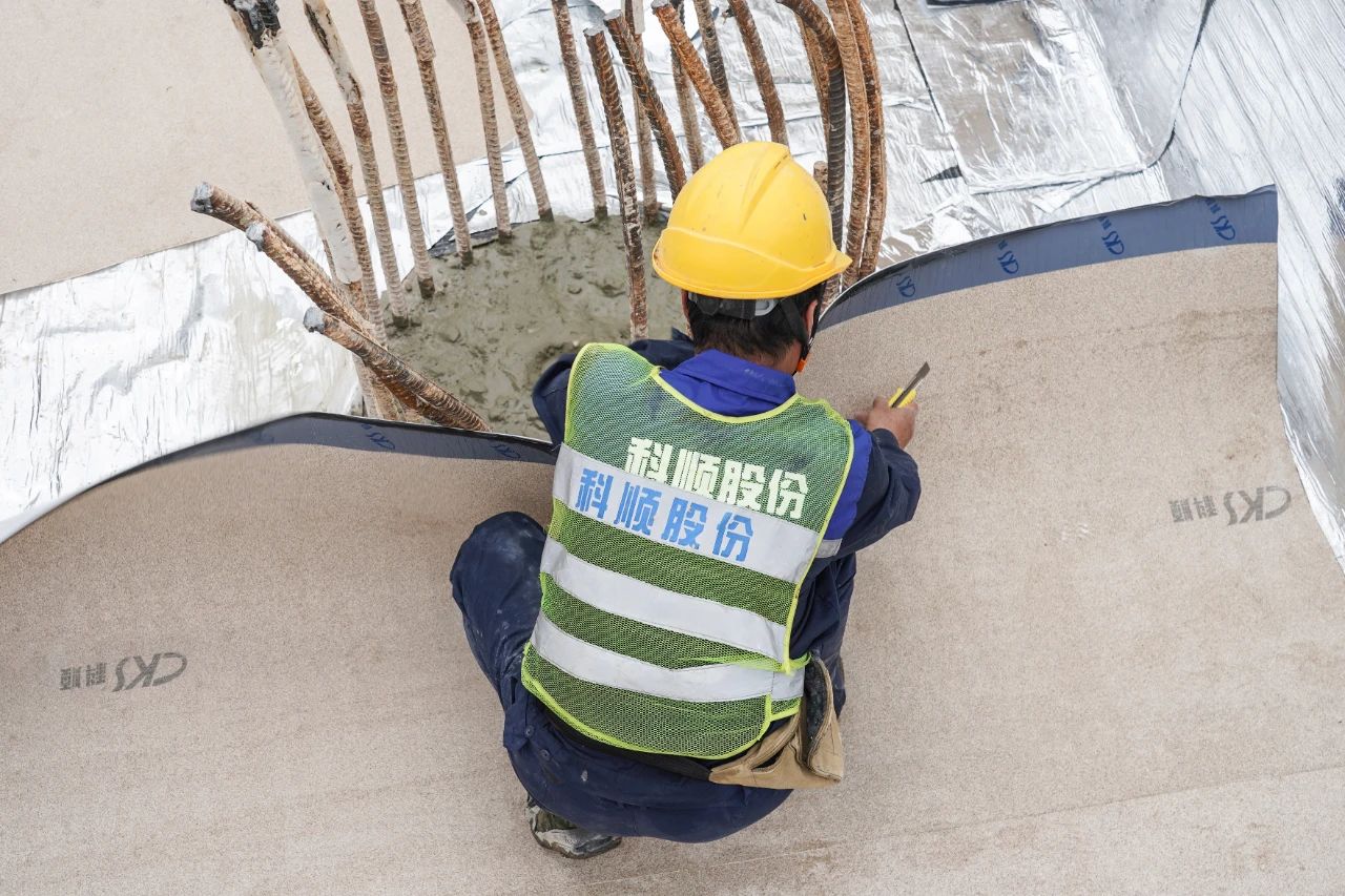 ·外設兩道防水層“APF-C”、“APF-3000”:(1)將APF-3000反鋪并機械固定在底板上,再進行搭接邊處理;(2)定位并預鋪APF-C后,撕開APF-3000隔離膜,實現卷材間滿粘粘結,大面與細部做法基本一致,最后處理搭接邊;